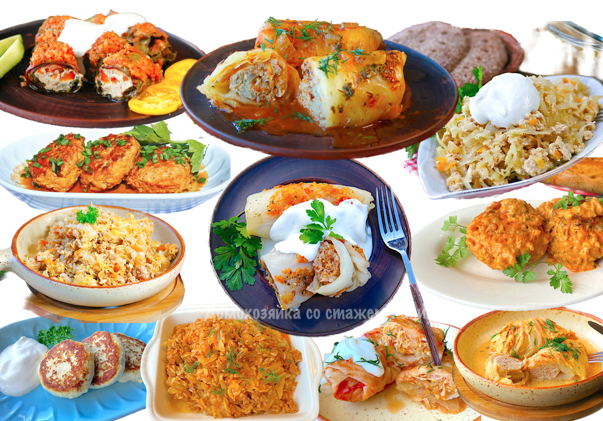 Известные всем голубцы, как правило, готовятся из капустных листьев, в которые заворачивается мясная начинка с рисом. Например, вот один из популярных рецептов:
