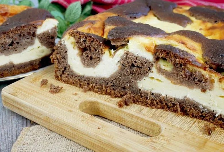 Творожную начинку готовят просто: творог взбивают с яйцами, сахаром и ванилином, затем вмешивают муку. Получившуюся смесь выкладывают на противень, застеленный пергаментом, неравномерно образуя пятна, поверх которых распределяют оставшуюся шоколадную массу полосами для яркого узора.