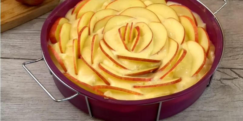 Яблоки нарезают кубиками, добавляют в тесто, чтобы каждый кусочек познал сладость начинки. Сформировать розу из яблочных пластинок и аккуратно уложить в форму, смазанную маслом, добавляет визуальную нотку и уют в каждую долю.