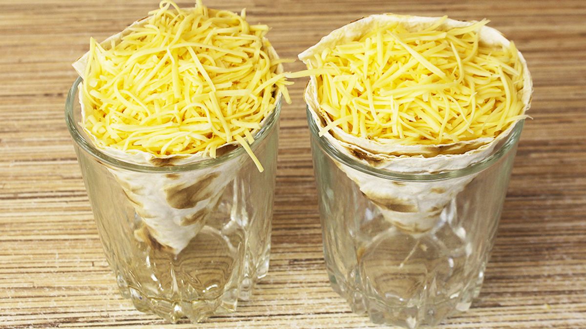 Рожки наполняют полученной смесью, сверху присыпают крупно натёртым сыром так, чтобы образовалась «шапка». Рожки остаются в стаканах и отправляются в микроволновку: мощность на максимум, время — около 60 секунд. Этого достаточно, чтобы сыр расплавился, а лаваш стал чуть хрустящим у краёв.