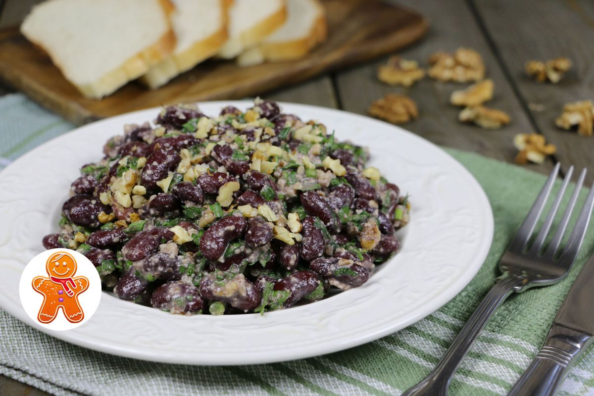 Ингредиенты подсказывают сценарий: быстро промыть фасоль, соединить с орехами, рубленой зеленью и чесночной ноткой, посолить и поперчить по вкусу. Простой шаг к сытному результату, который можно собрать за считанные минуты.