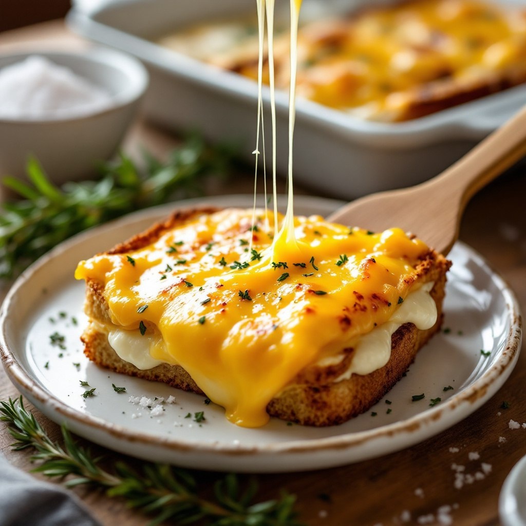 Шаг 3: Сборка бутербродов. Легко обмакните каждый ломтик батона в яично-молочную смесь и разложите их в один слой в смазанную форму или застеленную бумагой для выпечки. Сверху распределите творог, а затем посыпьте тертым сыром и прованскими травами. По желанию можно разместить слоями: второй ломтик хлеба на творог, а затем сыр и зелень.