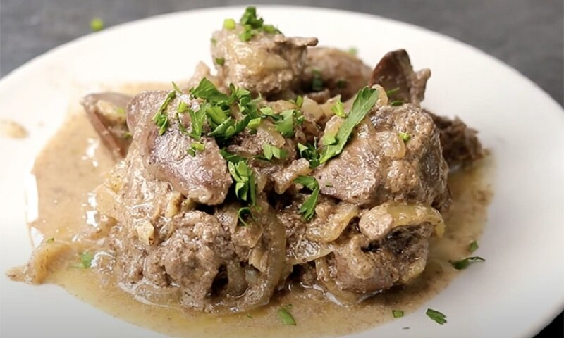 После выключения плиты сковороду не открывают еще 10 минут, чтобы печень пропиталась ароматами.