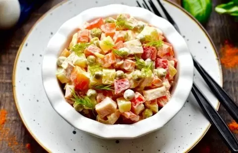 Этот легкий и витаминный салат выступает отличной альтернативой традиционному "Оливье". Освежающий и насыщенный вкус – именно то, что нужно для праздничного стола.