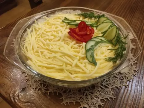 Теперь пришло время собирать салат. Лук заливается тонким слоем майонеза в салатнице. Затем укладывается предварительно нарезанная говядина, которую лучше всего разобрать на волокна. Этот слой также покрывается майонезом. Следующим этапом будет добавление натёртых на крупной тёрке яиц, которые также нужно промазать майонезом. И, наконец, завершаем сборку салата слоем тертого сыра. Для мягкого сыра, например, тильзитера, подойдет крупная тёрка, а для твёрдого — мелкая.