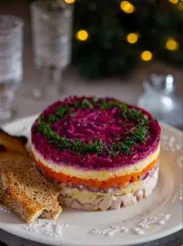 Сначала отварите морковь, свёклу и картофель до готовности, затем дайте им остыть. Не забудьте также отварить яйца и охладить их.Слоёный салат можно сформировать как в салатнице, так и на плоской тарелке с использованием сервировочного кольца.Снимите мясо с копчёной курицы, очистите от кожи и нарежьте мелкими кубиками. Выложите его первым слоем в салат.Промажьте курицу небольшим количеством майонеза или сделайте сеточку из майонеза для удобства подачи.Картофель очистите и натрите на крупной тёрке. Выложите его следующим слоем и снова нанесите майонез.Очистите красный лук и мелко нарежьте его. Выложите этот слой на картошку.Очистите морковь, натрите её на крупной тёрке и аккуратно распределите в салате. Не забудьте покрыть слой майонезом.Твёрдый сыр натрите и выложите его сверху, снова добавив майонез.Очистите яйца, натрите их на мелкой тёрке и смешайте с небольшим количеством майонеза. Этот слой выложите следующим.Свёклу очистите, натрите на крупной тёрке и добавьте измельчённый чеснок вместе с парой ложек майонеза. Этот цветной слой завершает салат.Перед подачей дайте салату немного охладиться в холодильнике. Украсить можно по своему желанию, а затем подать к столу.Приятного аппетита!