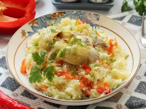 После того, как курица станет мягкой (примерно 25-30 минут), вливаем в кастрюлю с овощами подготовленный рис и добавляем горячую воду так, чтобы жидкость покрывала рис на один-два пальца. Посолите и поперчите по вкусу, затем готовьте с крышкой еще 15-20 минут до полной готовности. Проверяйте готовность риса, чтобы он остался рассыпчатым и легким.
