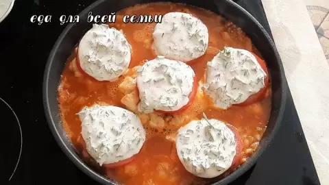 Затем необходимо подготовить овощи. Луковицу нарезать мелко, а томаты – пластинами. Для соуса смешать сметану, майонез, зелень с солью и специями, при желании добавить зубчик чеснока.