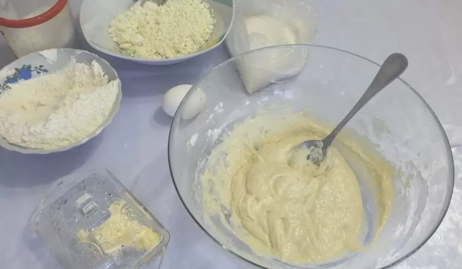 Тем временем готовится начинка: творог, сахар и яйцо тщательно перемешиваются с помощью вилки до однородной массы.