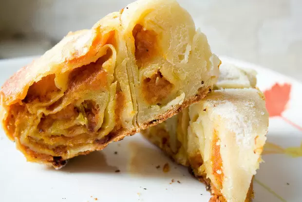 Сначала в глубокой миске смешать муку, яйцо и ? стакана теплой воды. Добавить 2 ст. ложки растопленного сливочного масла и 2 ст. ложки оливкового масла, немного соли и сахара. Замесить тесто до получения мягкой и упругой консистенции — важно, чтобы тесто не было слишком крутым.На следующем этапе тесто следует хорошо отбить, чтобы оно стало вытяжным. Для этого в течение около 10 минут нужно энергично швырять тесто на рабочую поверхность, попеременно использовав правую и левую руку.После этого завернуть тесто в пленку и оставить на 40 минут для отдыха.Тем временем подготовить начинку. Тыкву нарезать средними кубиками и обжарить на смеси сливочного и оливкового масел в течение 10 минут.Добавить бренди, щепотку сахара, соль и перец, продолжать тушить до готовности еще около 10 минут.Готовую тыкву размять в пюре, натереть брынзу и смешать все ингредиенты.Далее раскатать тесто на муке до максимальной тонкости. Важно аккуратно растянуть его так, чтобы сквозь тесто можно было прочитать газетный текст.Распределить начинку равномерно по тесту, затем, приподняв край полотенца, аккуратно свернуть рулет, формируя спираль.Перед выпечкой смазать рулет растопленным сливочным маслом, завернуть в фольгу и поместить в предварительно разогретую до 200 градусов духовку. Выпекать в фольге 25 минут, затем открыть фольгу и готовить еще 20 минут.Этот оригинальный рецепт станет настоящей находкой для тех, кто хочет удивить своих близких изысканным домашним блюдом. Приятного аппетита!