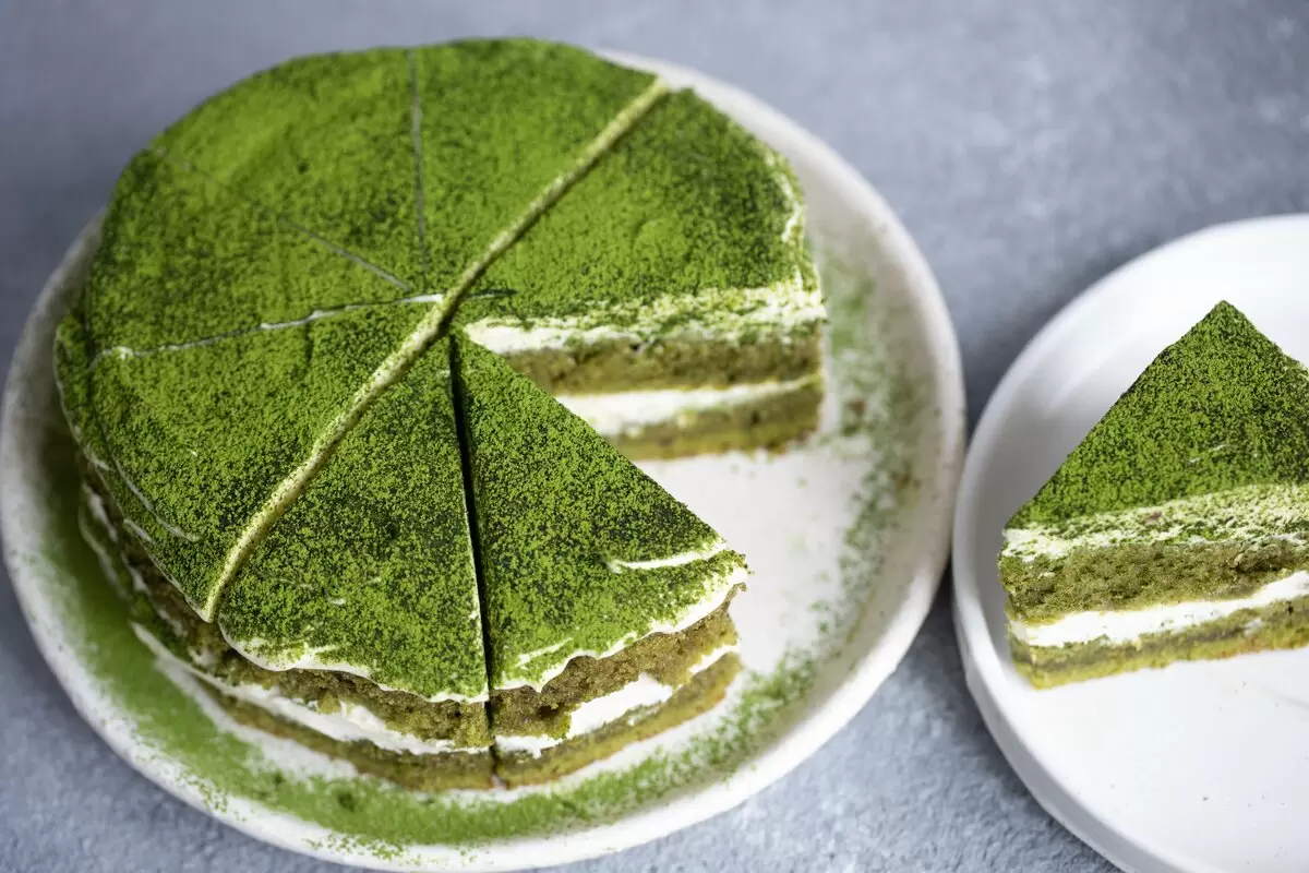 В глубокой миске комбинируют муку, сахар, матча, соль, соду и разрыхлитель. Затем добавляют яйца и растительное масло, тщательно перемешивая до получения однородной массы. Далее вливают кефир и снова перемешивают. Оставляют тесто на 10 минут для достижения нужной консистенции.В форму диаметром 18 см наливают половину теста и выпекают при температуре 170 градусов в течение 20-25 минут. Проверяют готовность с помощью зубочистки: если она выходит сухой, корж готов. Остужают корж в течение 30 минут. Повторяют процесс с оставшейся частью теста.Холодное сливочное масло нарезают кубиками и перемешивают с сахарной пудрой с помощью миксера, пока масса не станет слегка белесой. Затем добавляют творожный сыр и взбивают до однородности.Чтобы достичь большей многослойности, коржи можно разрезать на две части и промазывать их кремом. Для сочности рекомендуют оставить торт в холодильнике на ночь.