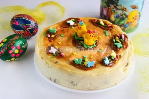 После этого аккуратно переложите массу в форму, разровняйте верх. Поместите в глубокий противень, залив кипятком до середины высоты формы, и ставьте в разогретую духовку. Выпекайте 90 минут, проверяя готовность с помощью шпажки. После завершения выпечки оставьте пасху остывать в духовке на 3-4 часа.