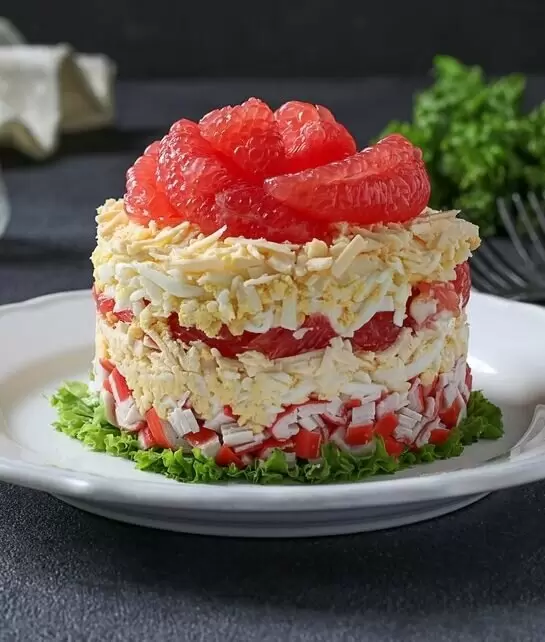 Восхитительный слоёный салат с крабовыми палочками и грейпфрутом для праздничного стола
