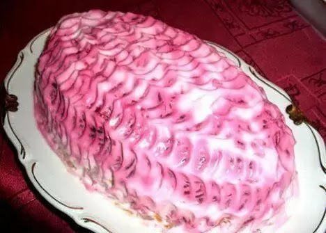 Сельдь нужно очистить, промыть и удалить косточки, после чего рыбное филе также нарезается кубиками. Сам процесс сборки готового блюда проходит в несколько слоев: