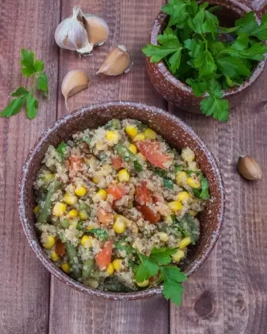 Представляем вашему вниманию оригинальный рецепт постного салата, в составе которого киноа, зелёная фасоль, кукуруза и свежие помидоры. Киноа обеспечивает сытность, а свежие овощи и зелень придают блюду легкость и живость. Этот салат прекрасно подходит как в холодном, так и в тёплом виде, а также может стать самостоятельным угощением или восхитным гарниром к мясным или рыбным блюдами.