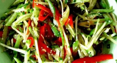 - Далее удалить семена из перца, очистить лук от шелухи. Овощи нарезать тонкими полосками – огурцы, перец и лук – и соединить с редькой и морковью. Все тщательно перемешать.