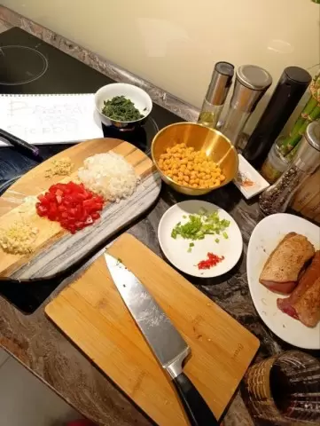 Начинаем с обжаривания помидоров, чеснока и лука с имбирём и чили — фоном остаётся запах свежести и лёгкой остроты. К овощам добавляется шпинат и нут, затем заходит карри-соус, и вся композиция тушится на среднем огне всего несколько минут — вкус сгущается, но остается лёгким.