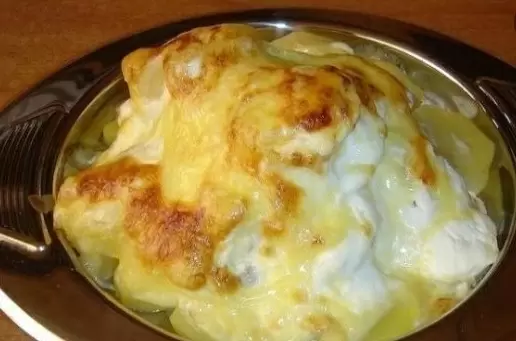 4. Сборка блюда. В смазанной сметаной форме распределите отварной картофель, нарезанный ломтиками, затем уложите рыбу, жареные грибы с луком и нарезанные вареные яйца. Посыпьте тертым сыром и залейте оставшейся сметаной.