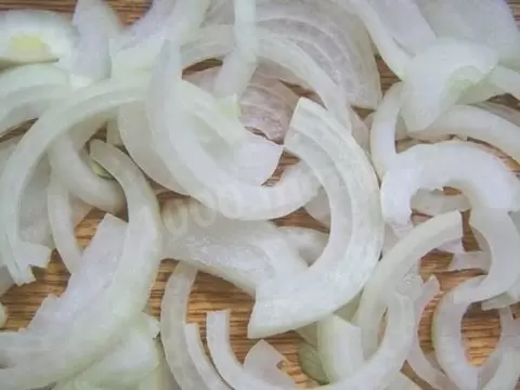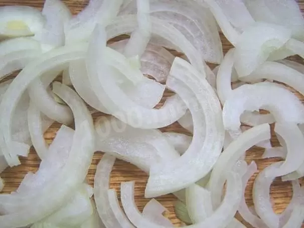 На сковороде с толстым дном (лучше чугунной) разогреть оливковое масло. Пока нагревается масло, очистите лук и нарежьте его полукольцами. Добавьте лук на сковороду и обжаривайте до мягкости.