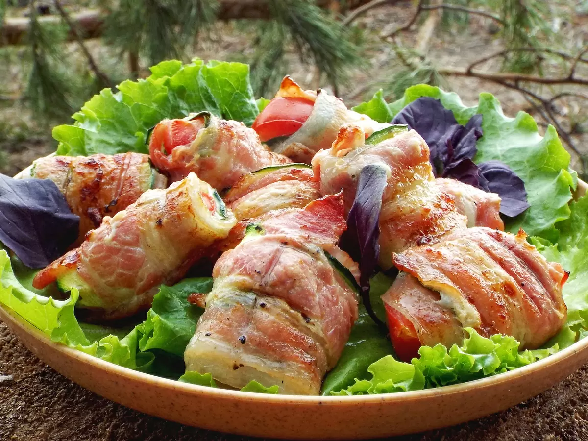 Рецепт идеально подходит для больших компаний, где голоса клиентов различаются. Не нужно вымачивание или приготовление целых шашлыков. Достаточно нарезать кабачки на тонкие полоски, завернуть их в бекон, добавить пару ломтиков помидоров и положить на решетку гриля. Сочно внутри и хрустяще снаружи, это блюдо порадует даже тех, кто не особенно любит кабачки.