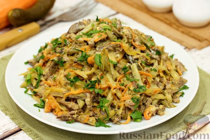 - Салат с куриной печенью и овощами: великолепная комбинация жареной куриной печени с солеными огурцами и морковью не оставит равнодушными даже самых притязательных гурманов.