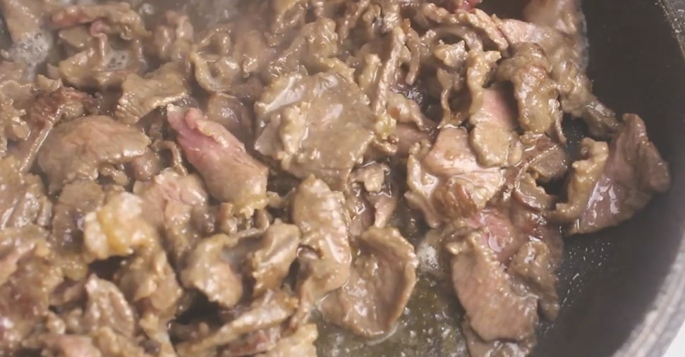 Когда мясо начнет подрумяниваться, добавьте нарезанный кольцами лук, а также соль и перец по вкусу. Дождитесь, пока говядина не станет мягкой, после чего дайте ей немного остыть.