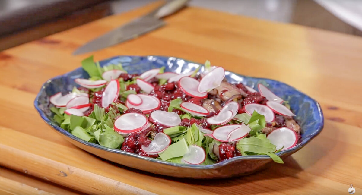 Наконец, поливаем сверху вишневым соусом и украшаем нарезанным редисом. В итоге получится оригинальный салат с ярким сочетанием вкусов - кислинка щавеля, чесночный аромат черемши и сладость вишневого соуса идеальны с печенью.