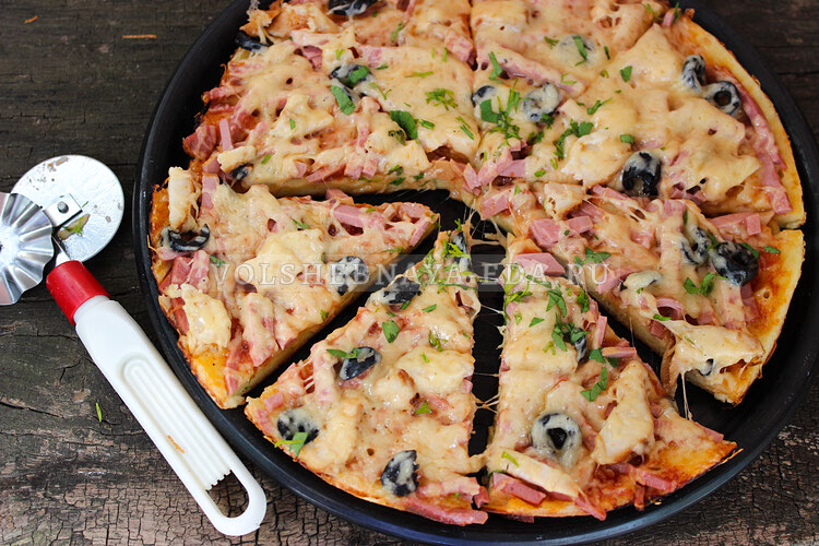 Теперь сковороду диаметром 28-30 см с антипригарным покрытием следует немного смазать растительным маслом. Влить тесто и ровно распределить по поверхности, затем сверху намазать кетчупом или другим томатным соусом. Начините пиццу по своему вкусу, добавляя ингредиенты: вареную колбасу, куриную грудку, грибы, оливки и болгарский перец. Не забудьте обильно посыпать тертым сыром.