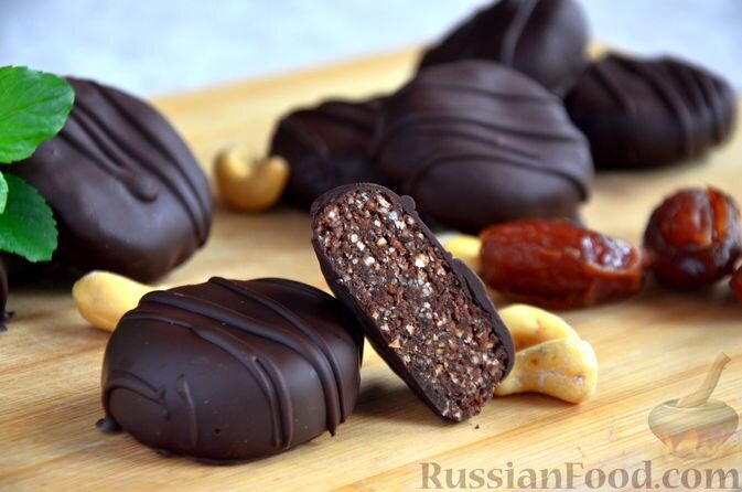 - Конфеты из овсяных хлопьев с финиками и орехами: Эти угощения не содержат сахара, а их сладость обеспечивают финики и мед, выставляя в идеальном свете вкус какао и растопленного шоколада.