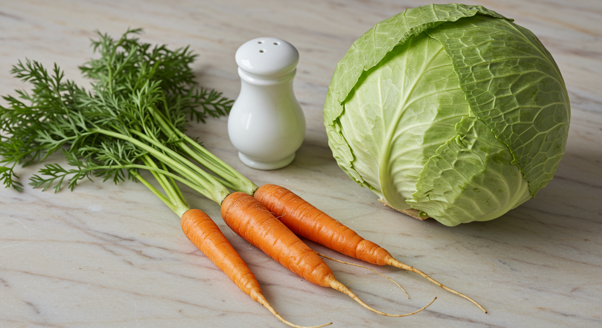 - Капуста белокочанная: 1 кг. Плотные кочаны с белоснежной сердцевиной — лучший выбор.