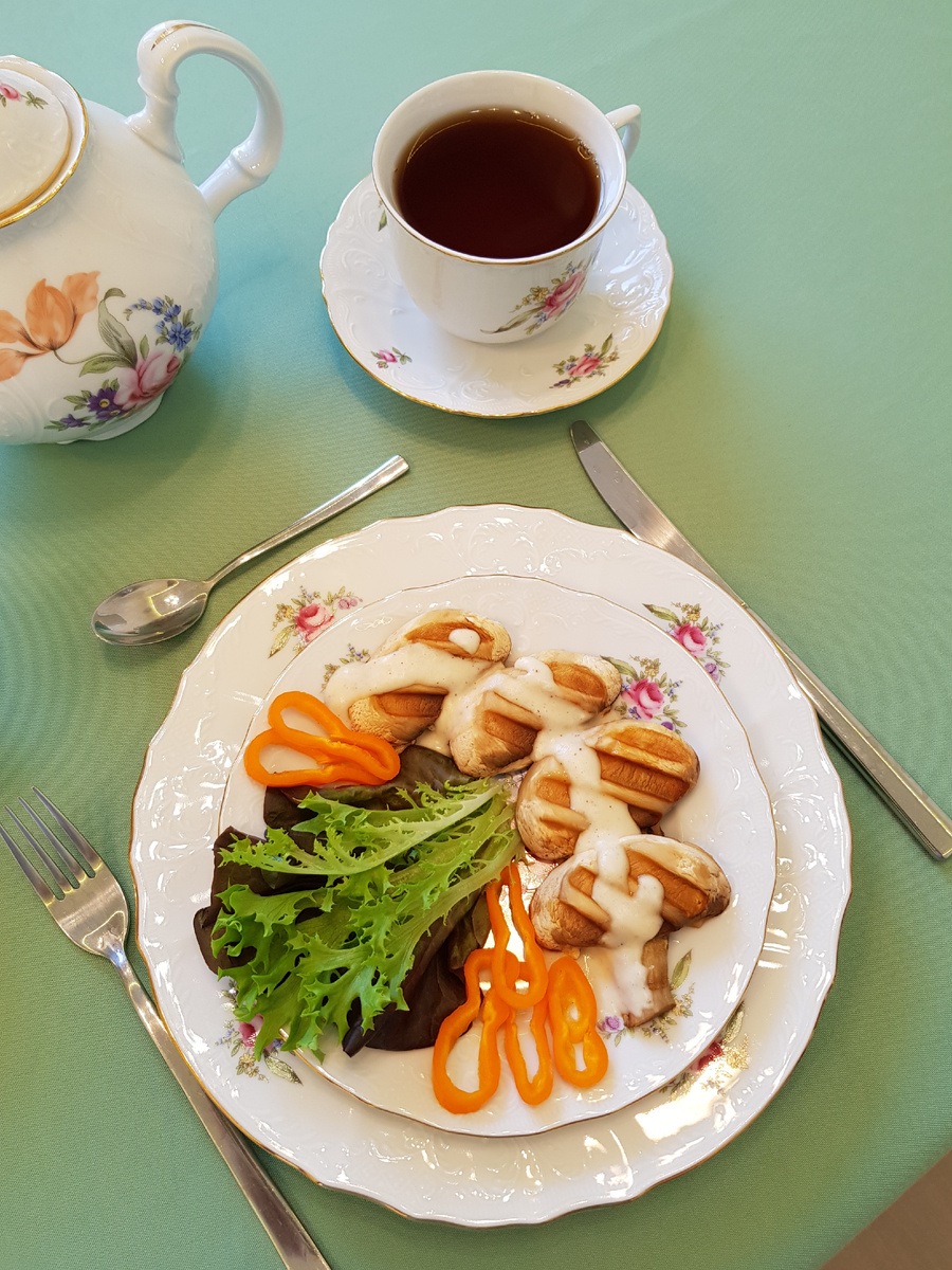 По завершении запекания выложите на тарелки свежие листья салата и аккуратно разместите на них жареные шампиньоны. Обильно полейте все горячим соусом «Субиз», который добавит неповторимый вкус и аромат этому блюду. Не забудьте дополнить угощение ломтиками сладкого перца для яркости и свежести.