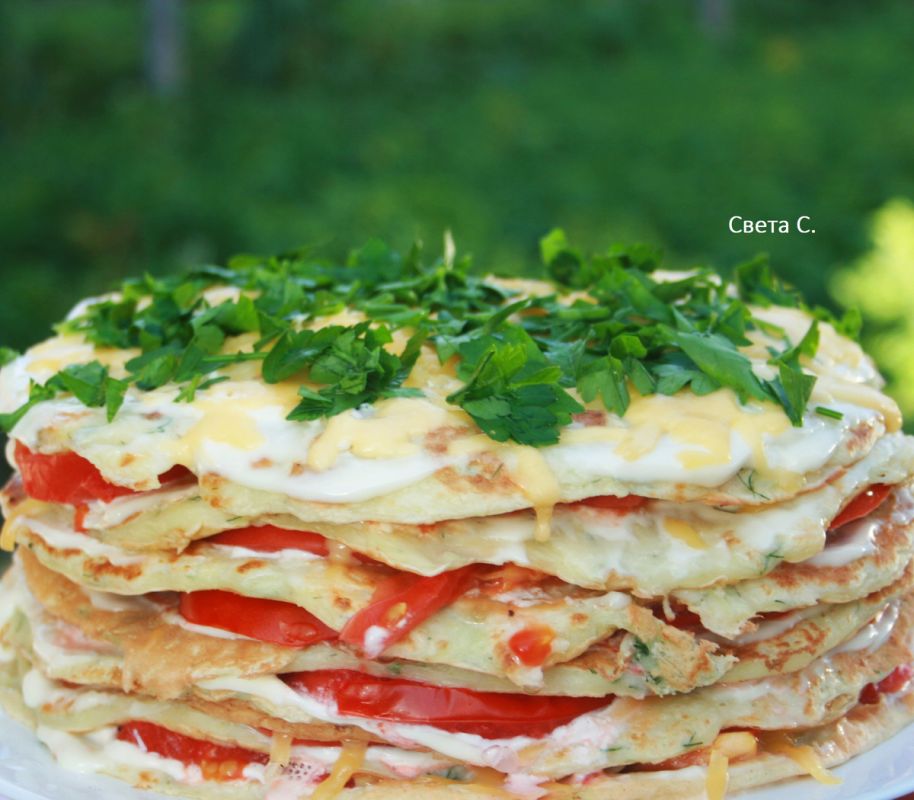 Параллельно натереть чеснок и смешать его с майонезом. Когда блины будут готовы, смазывать каждый из них майонезом, укладывать тонко нарезанные помидоры и посыпать тертым сыром.