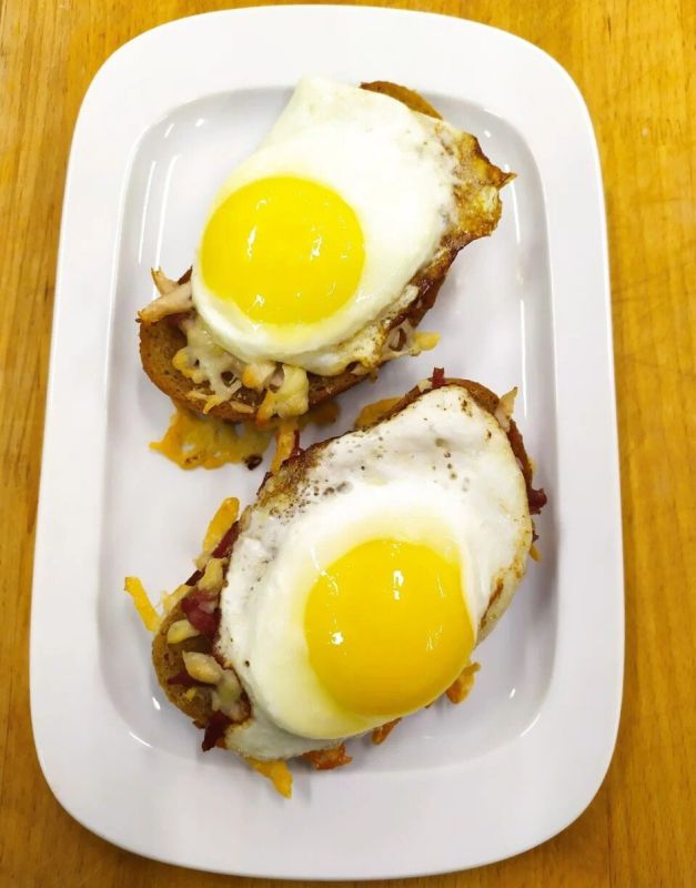 Процесс приготовления прост и увлекателен. Сыр следует натереть на крупной терке, ветчину нарезать соломкой, а затем смешать эти ингредиенты. Полученную массу выложить на ломтики хлеба и запечь в разогретой до 200°C духовке в течение 5-7 минут. Пока бутерброды подрумяниваются, на сковороде можно пожарить яйца, посолив и поперчив их по вкусу. Как только хлеб подрумянится, яйца выкладывают сверху и подают горячими.