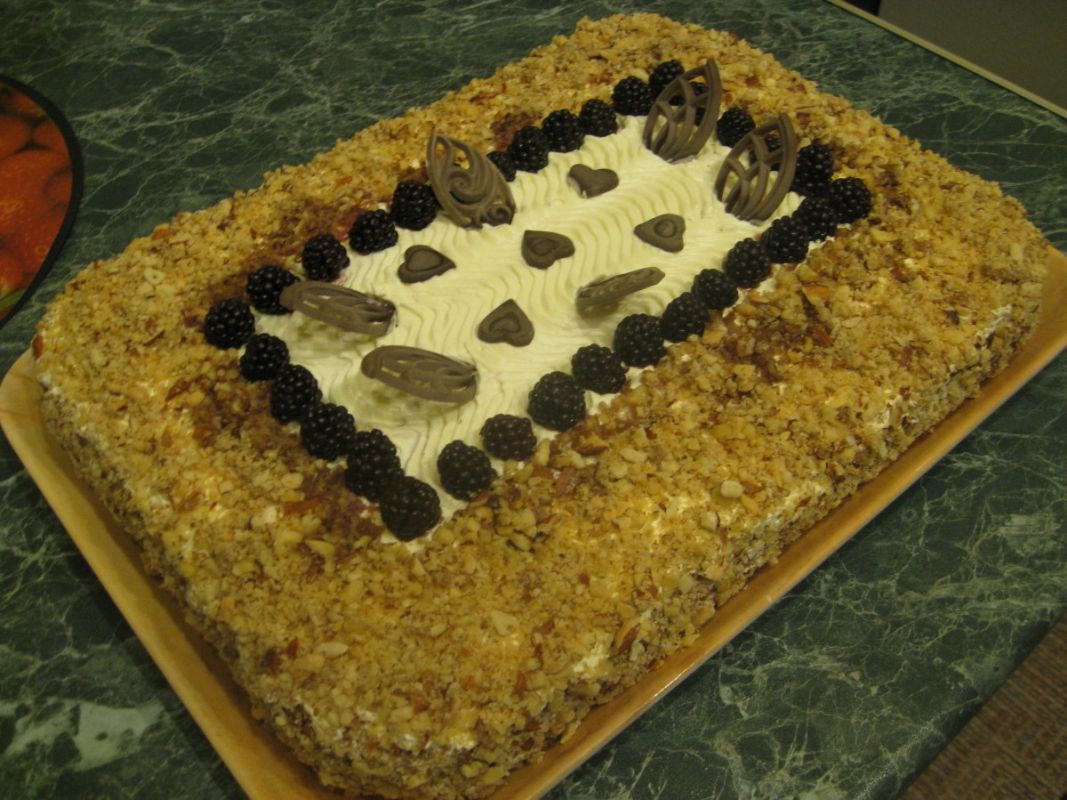 6. Обмазать торт оставшимся кремом и украсить дроблеными орехами, свежей ежевикой и декором. Дать настояться минимум 8 часов, чтобы торт полностью пропитался.
