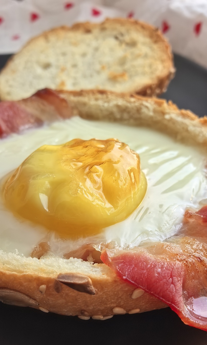 - Идеальное сочетание. Хрустящая булка, соленый бекон и нежный запечённый желток.