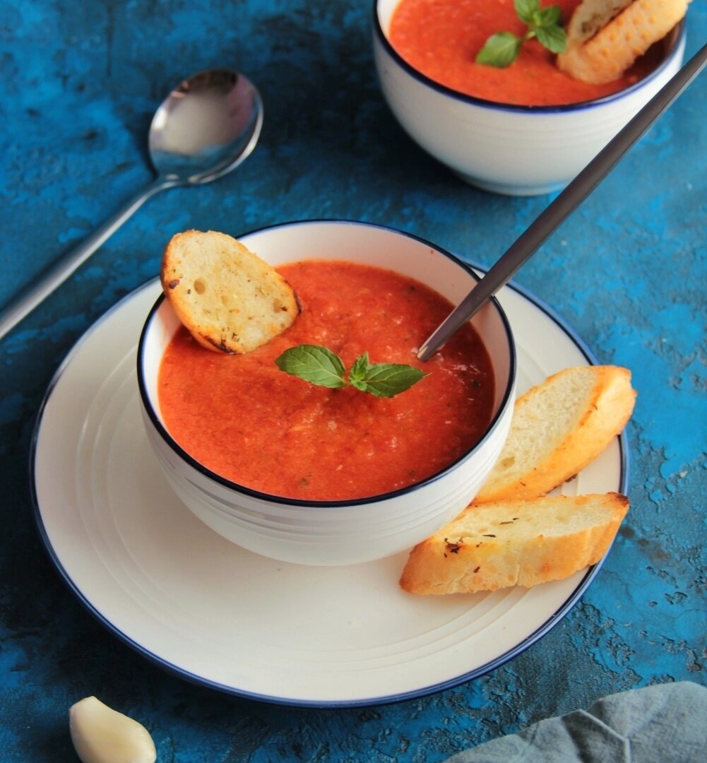 Сегодня в меню будет а-ля гаспачо с ароматными чесночными гренками, обжаренными на оливковом масле с добавлением средиземноморских трав!