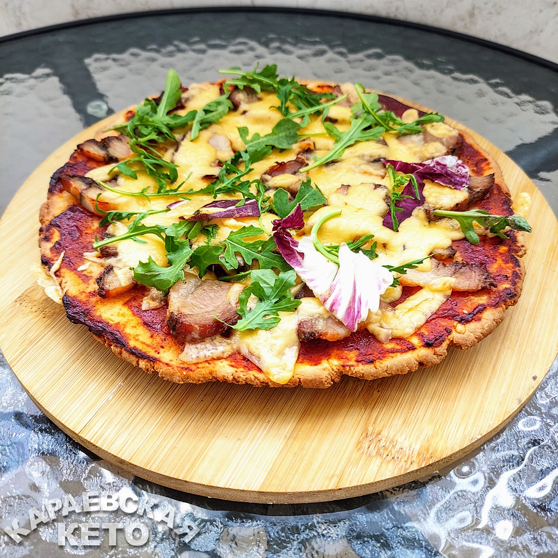 На готовую основу нанесите слой домашнего кетчупа, разложите начинку и посыпьте тертым сыром. Выпекайте при температуре 180°C до готовности теста, и ваша кето пицца готова!