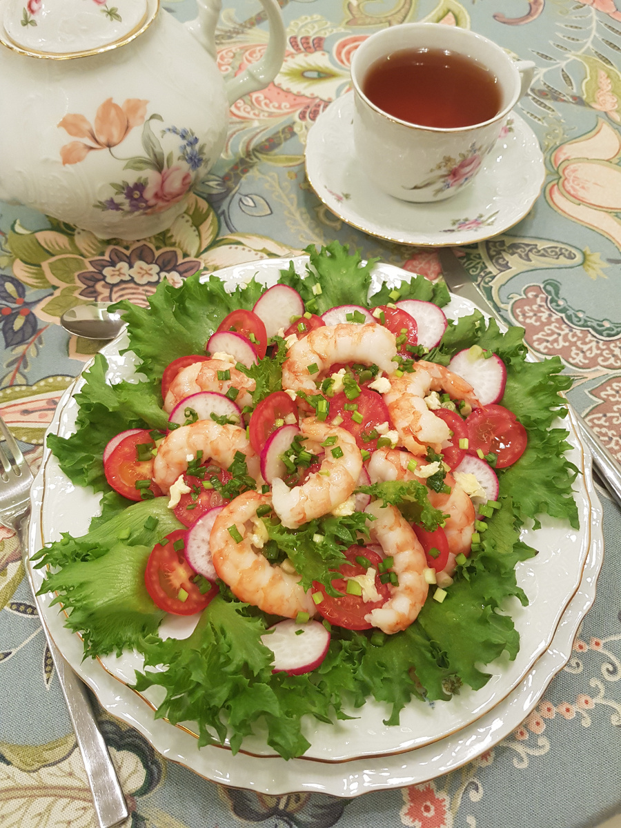 На тарелку выложить промытые листья салата, в центр положить омлет, сверху разместить креветки, томаты и редис. Перед подачей посыпать зеленым луком и полить свежевыжатым соком апельсина.