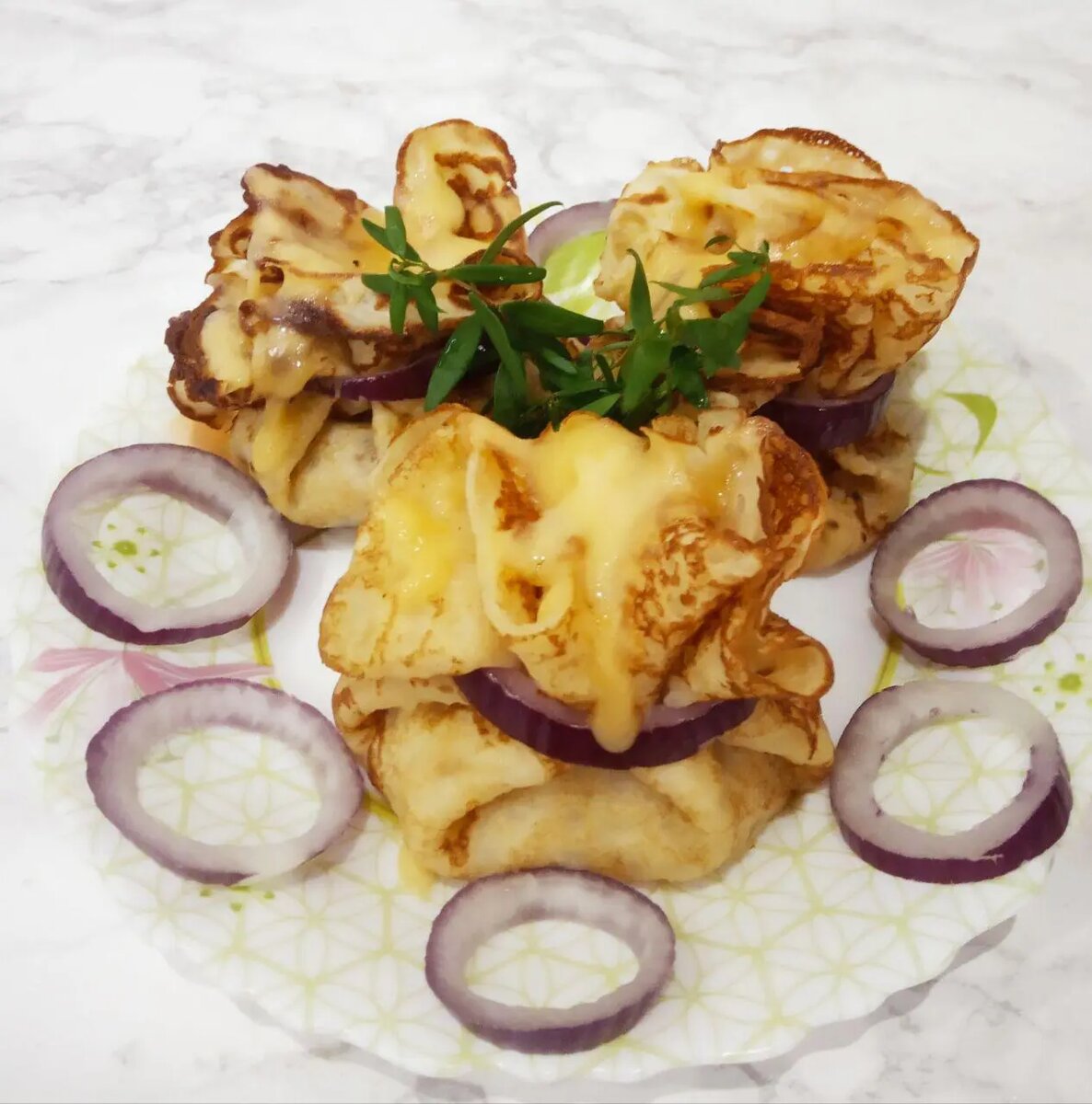 На готовые блины выкладывается начинка, после чего их заворачивают в виде мешочков и завязывают колечками маринованного лука. Сыр натирается на крупной терке и посыпается сверху. Перед подачей блинчики смазываются майонезом и отправляются в духовку на 10 минут, чтобы стать более аппетитными.