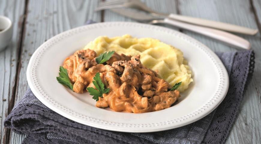 5. Влейте в сковороду бульон, доведите до кипения и тушите 10-12 минут. Верните обжаренное мясо в сковороду, перемешайте и готовьте еще 3 минуты. Затем добавьте сметану и вустерский соус, аккуратно прогрейте, но не доводите до кипения. Бефстроганов подавайте горячим вместе с картофельным пюре или широкой лапшой, сообщает канал.