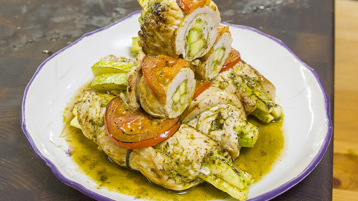 Кабачок следует разрезать вдоль на четыре части и удалить семена, нарезав оставшуюся мякоть длинными брусочками. Затем нужно приправить мясо солью и перцем, щедро намазать его соусом песто.