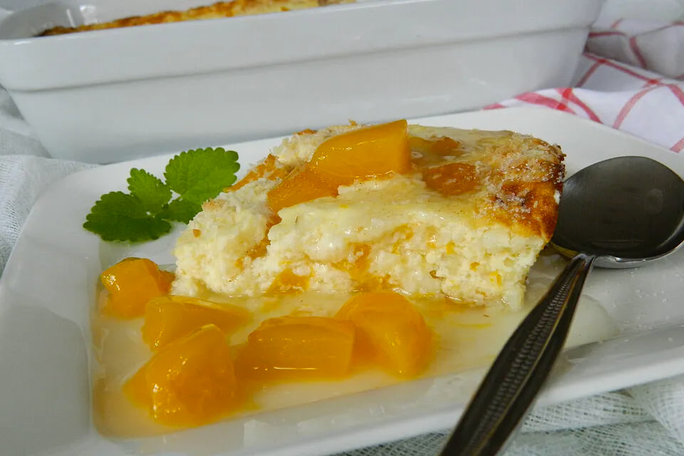 Сегодня предлагаем альтернативу! Наш пудинг сделан без слив и изюма. Это рисовый пудинг с персиками, в составе которого также творог, что придаёт ему запечённую нотку. На первый взгляд он напоминает запеканку, но мы с удовольствием называем его пудингом.