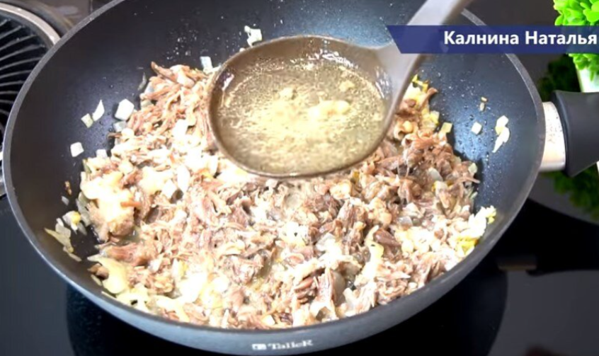 Разогрев масло на сковороде, обжаривают лук до полупрозрачности, добавляют мясо, обжарить еще пару минут. Затем вливают бульон и томят в течение пяти минут.