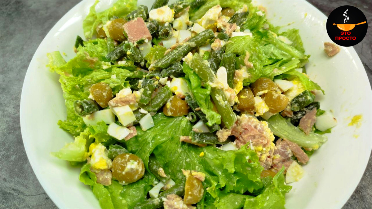 Сначала отварите стручковую фасоль в слегка подсоленной воде около 5-7 минут до готовности, затем охладите. Нарежьте яйца кубиками, а оливки пополам. На сервировочную тарелку уложите рваные листья салата, добавьте яйца, тунца, оливки и стручковую фасоль. Полейте лимонным соком и оливковым маслом. Перемешайте перед подачей. Этот салат прекрасно заменит полноценный ужин.