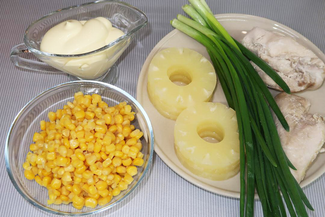 В глубокой миске смешиваются все подготовленные ингредиенты: филе, ананасы, предварительно отжатая кукуруза и нарезанный лук. После этого добавляют майонез по вкусу и тщательно перемешивают.