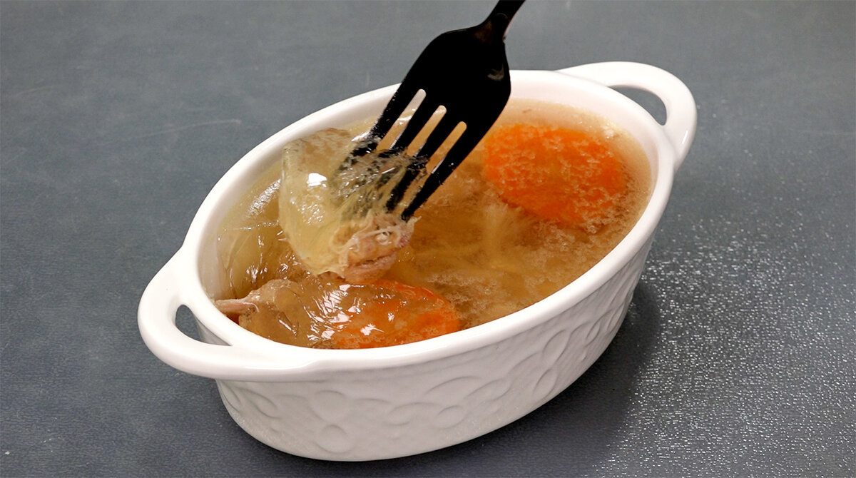 Следующий шаг — разобрать мясо на волокна, размещая его в формочках вместе с нарезанной морковью. Процеженный бульон попадает в формочки и ставится в холодильник для застывания. В результате получается невероятно вкусный и аппетитный холодец!
