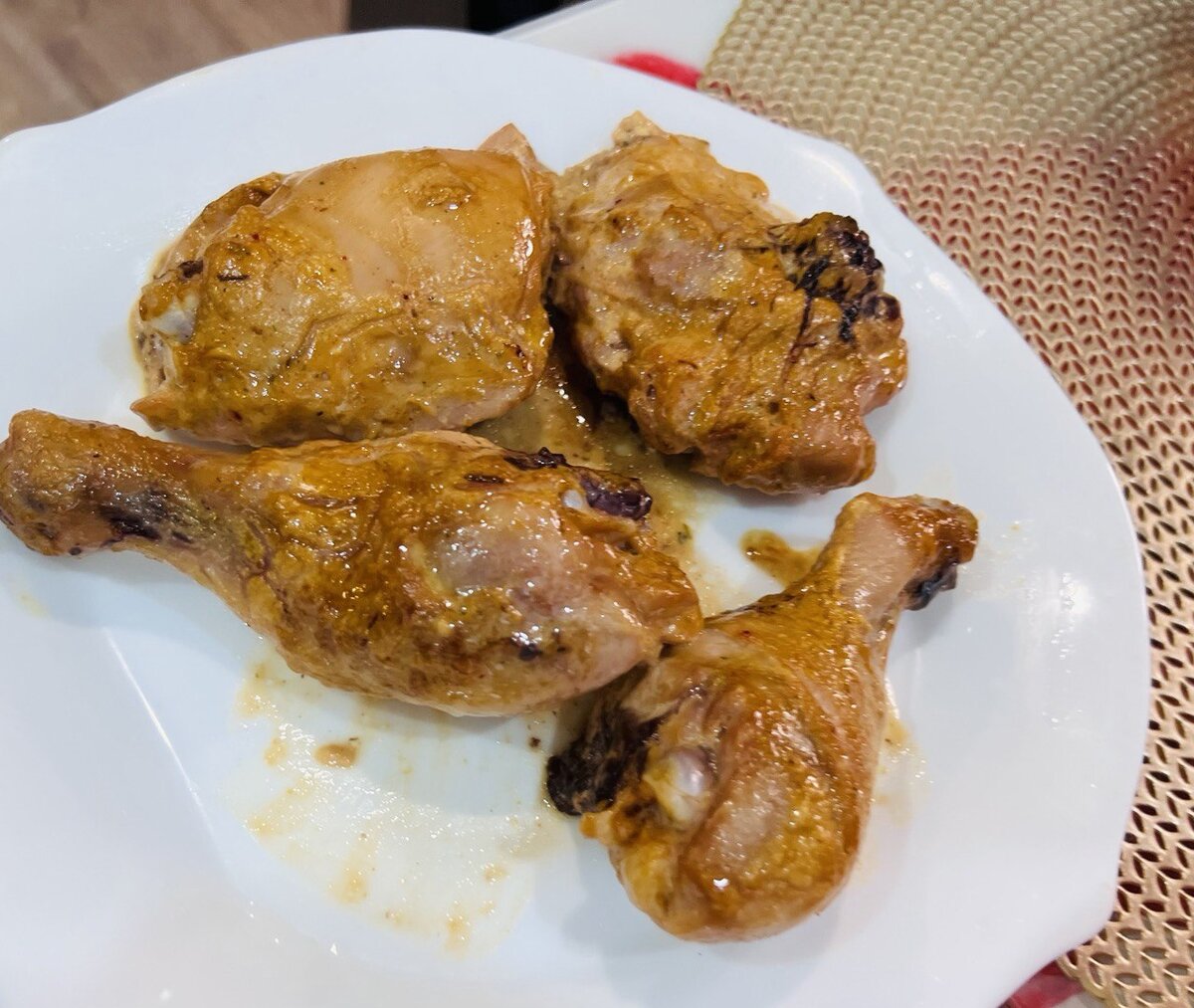 Готовность курицы можно проверить, проколов мясо в самом толстом месте — если соки прозрачные, значит, блюдо готово. После приготовления куриные голени и бедра стоит немного остудить и подавать с любыми гарнирами, будь то картофельное пюре, овощи или свежий салат.
