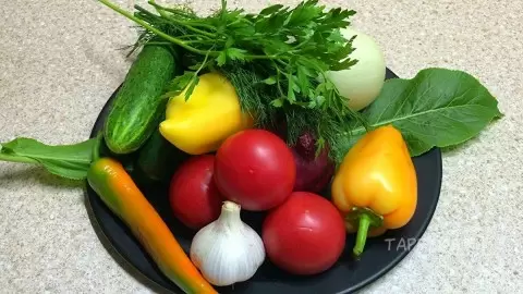 Для засолки понадобятся свежие овощи. Их предварительно необходимо тщательно вымыть и обсушить. Огурцы желательно нарезать на четвертинки, а кабачки — круглыми ломтиками. Помидоры, в зависимости от размера, можно разделить на двадцать, или на четыре части. Не забудьте и про чеснок: раздавите несколько зубчиков, чтобы добавить аромата, и подготовьте зелень — петрушку, укроп и листья хрена.