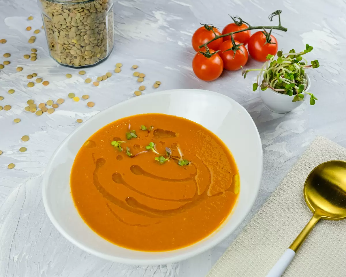 Этот суп — настоящая находка для любителей ярких и насыщенных вкусов. Обладая теплым золотистым оттенком, он напоминает тыквенное блюдо, однако именно чечевица и томаты придают ему уникальный оранжевый цвет. Приготовить его невероятно просто, а если под рукой не окажется блендера, возможен вариант не менее аппетитной чечевичное похлёбки!