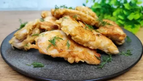 Спустя полчаса добавляем в маринованное мясо 2-3 ст. ложки муки и снова перемешиваем. Обжариваем куриные пласты на разогретой сковороде с растительным маслом по 2-3 минуты с каждой стороны до золотистого цвета.